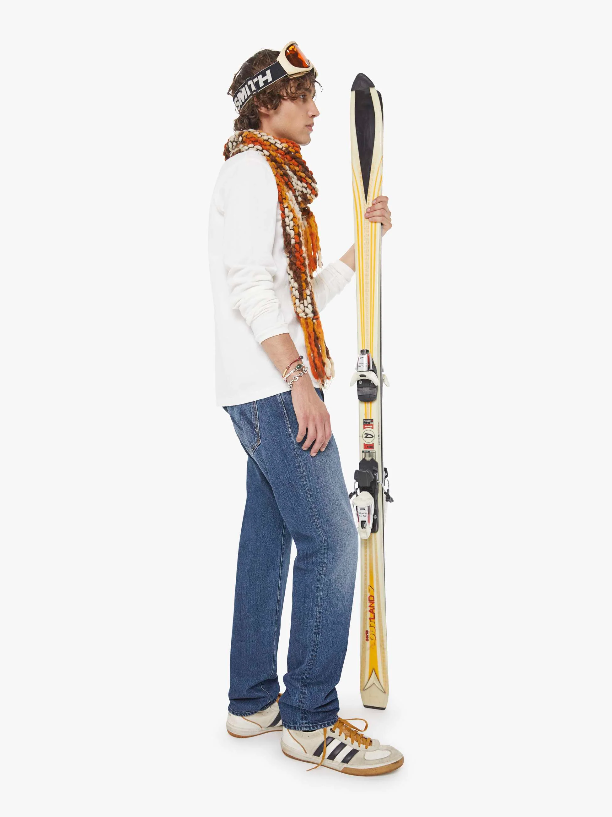My treat. A standard straight leg with a mid rise, button fly and 32-inch inseam with a clean hem. Made from 100% cotton denim, First Round On Me is a mid-blue with whiskering and fading at the knee.