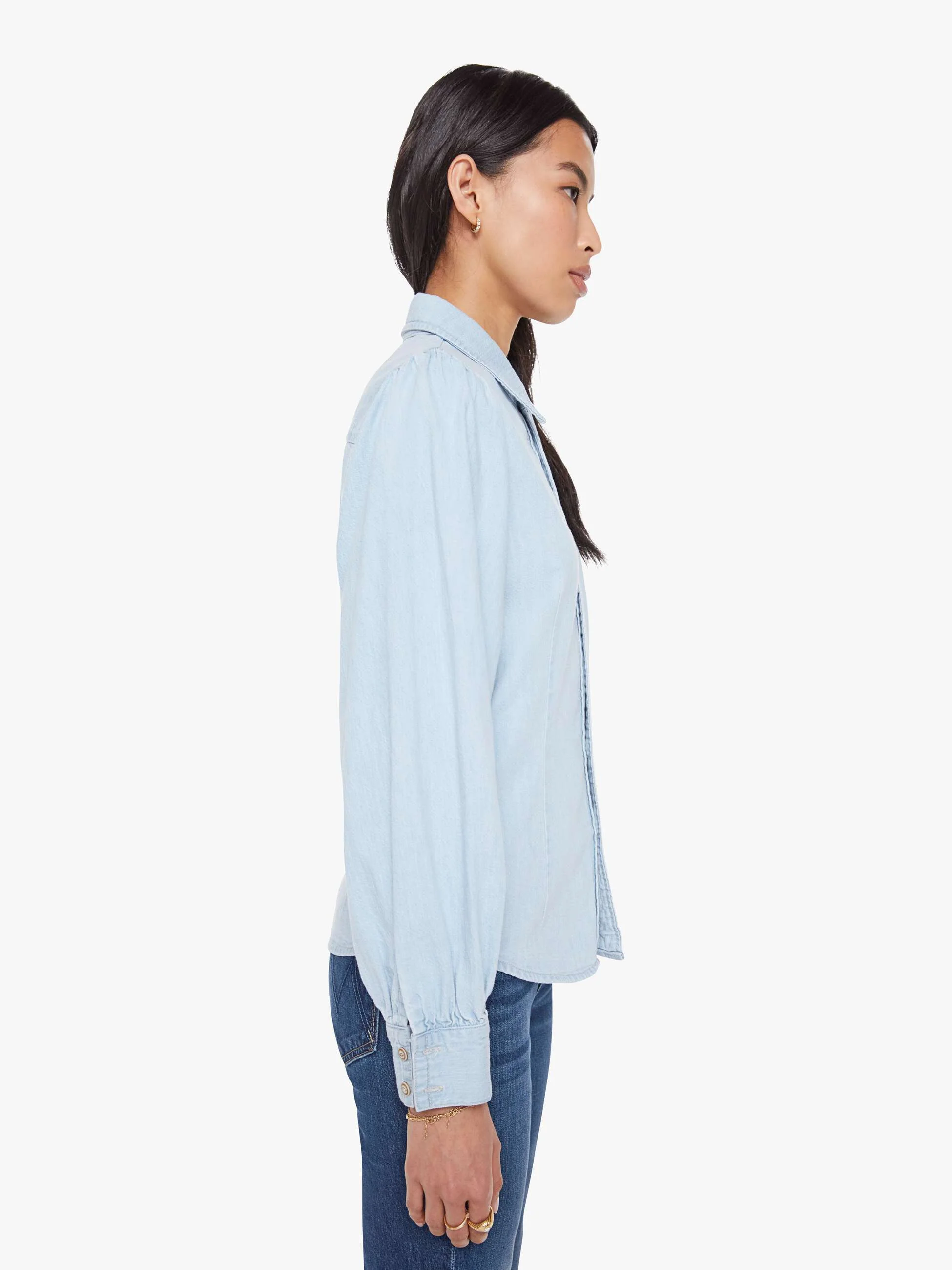 Easy does it. A button-up denim top with long balloon sleeves and a slightly tapered waist. Made from 100% cotton, Less Is More is a light blue with subtle fading throughout.