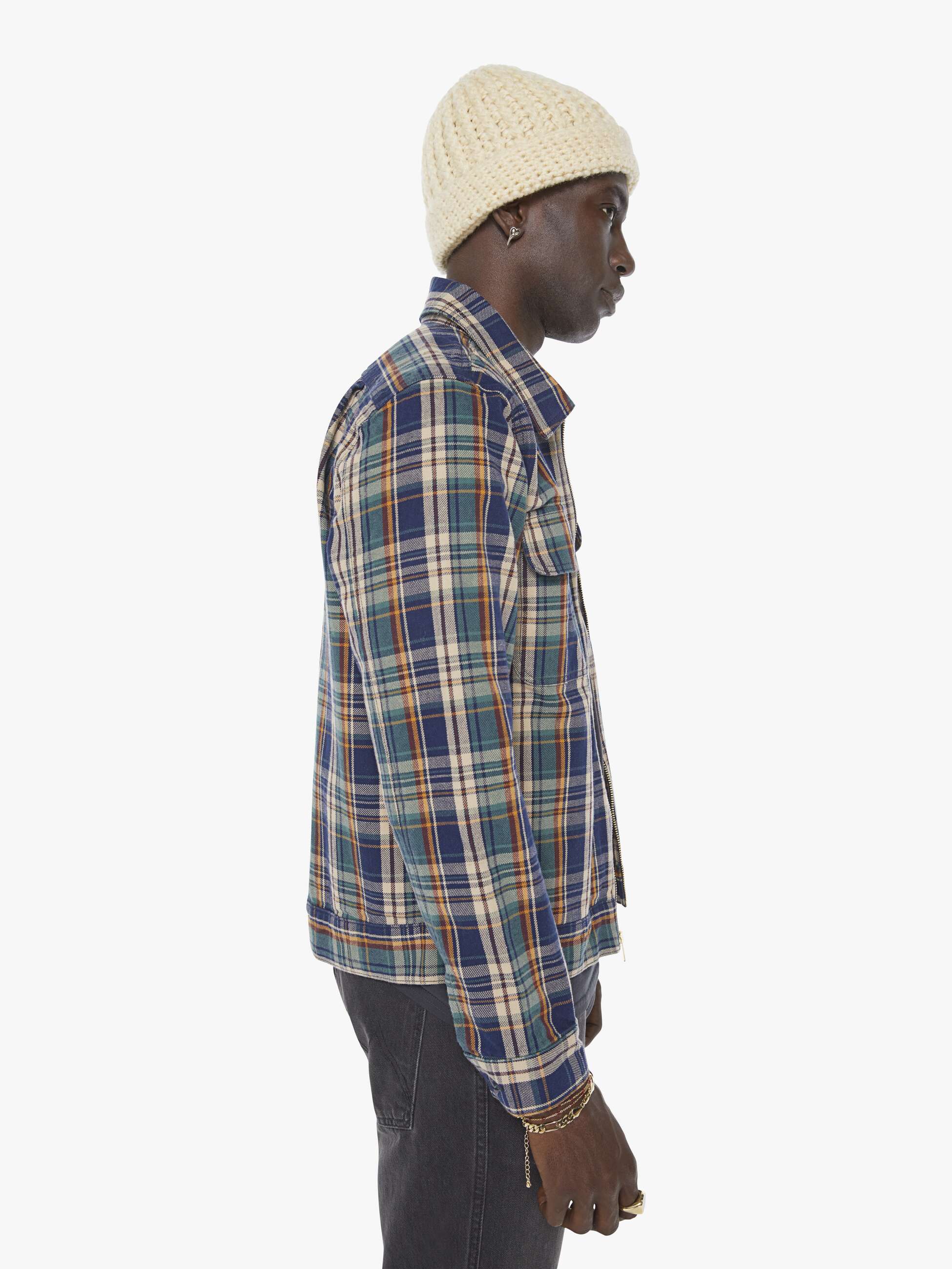 Check it out. A collared zip-up jacket with patch pockets, long sleeves and a slightly cropped fit. Made from 100% cotton, Fair And Square is a navy, green and orange plaid print.